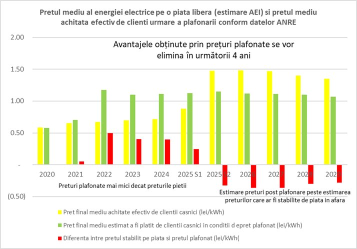 Analizând pentru perioada 2020 – 2025, evoluția prețului mediu achitat efectiv de clienți urmare a plafonării conform datelor ANRE și previziunile prețului mediu al energiei electrice care s-ar fi format pe o piață liberă, dacă nu se aplica plafonarea prețului (estimare AEI) și estimările de preț pentru cele două scenarii pentru următorii 4 ani se poate constata următoarele: