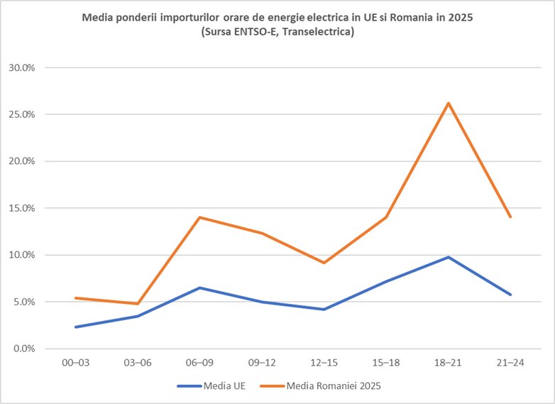 Ponderea importurilor/exporturilor medii în România 2025 — agregate pe intervale de 3 ore