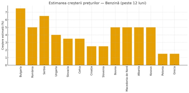 Când Bulgaria sau România se confruntă cu creșterea rapidă a prețului, presiunea se vede imediat în lanțul regional al aprovizionării. Aici, scumpirile în primul trimestru se pot situa între 3–10% pentru benzină și 3–12% pentru motorină, în funcție de poziție fiecărei țări pe rutele comerciale.