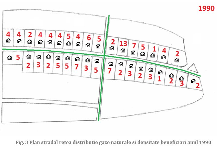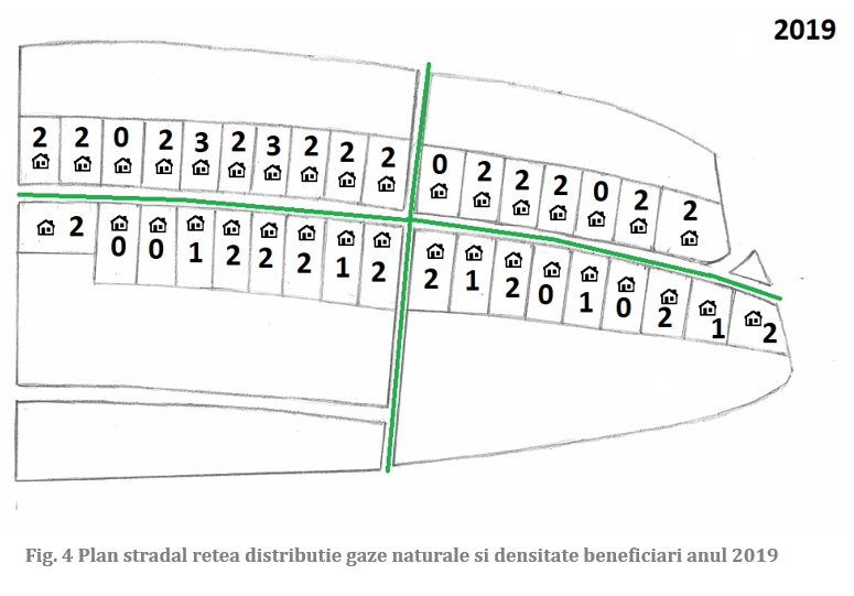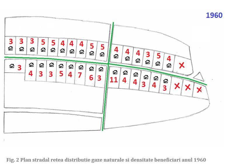Cu o mare provocare se confruntă clienţii casnici din România, dar şi operatorii reţelelor de distribuţie gaze naturale. Las mai jos planul unei străzi din municipiul Mediaş şi schiţa simplificată a reţelei de distribuţie gaze naturale de presiune redusă cu o lungime de aproximativ 750 metri. Reţeaua a fost instalată în anul 1958, înlocuită în totalitate în anul 1994 şi înlocuită din nou în anul 2018. O perioadă de şaisezeci de ani, în care infrastructura de distribuţie a gazelor naturale a fost înlocuită de doua ori, timp în care “piaţa locală” s-a redus de la 132, 140 beneficiari în anii 1960 şi 1990 la 54 în anul 2019 (NB: din care locuitori activi din punct de vedere economic 14, şi doar 1 sub vârsta de 18 ani).