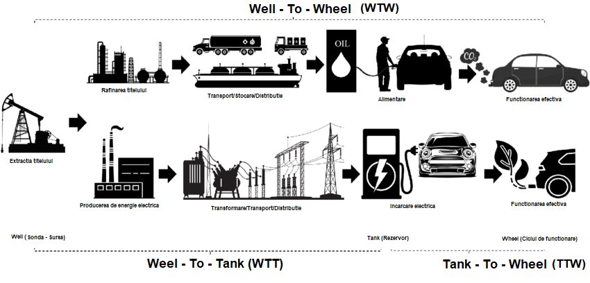 *) S-a considerat km medii parcurși în ciclul de viață de 250.000 km-mașini combustibili clasici, și 110.000 km-mașini electrice, cu schimbarea bateriilor după 100.000 km parcurși și adiționarea emisiilor de CO2 echivalent pentru această schimbare.