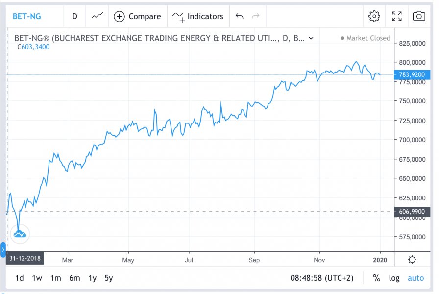Indicele sectorului energetic de la bursă, BET-NG, s-a apreciat cu puțin peste 30% în 2019, la 785,89 puncte, liderul creșterilorfiind Nuclearelectrica (SNN), cu un plus de 74%, la 14,26 lei/acțiune.