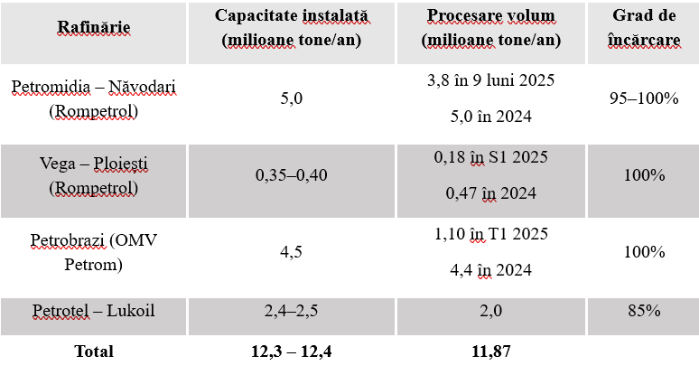 O imagine de ansamblu, asupra rafinăriilor active din România, ne permite să analizăm capacitatea de rafinare și gradul de încărcare (utilizare a capacităților).
